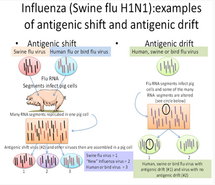 The 2009 pandemic-causing H1N1 virus was a classic example of antigenic shift. Research showed that novel H1N1 swine flu has an RNA genome that contains five RNA strands derived from various swine flu strains, two RNA strands from bird flu (also termed avian flu) strains, and only one RNA strand from human flu strains. According to the CDC, mainly antigenic shifts over about 20 years led to the development of novel H1N1 flu virus. A diagram that illustrates both antigenic shift and drift can be found below (see Figure) and features influenza A types H1N1 and bird flu (H5N1), but almost every influenza A viral strain can go through these processes that changes the viral RNA.